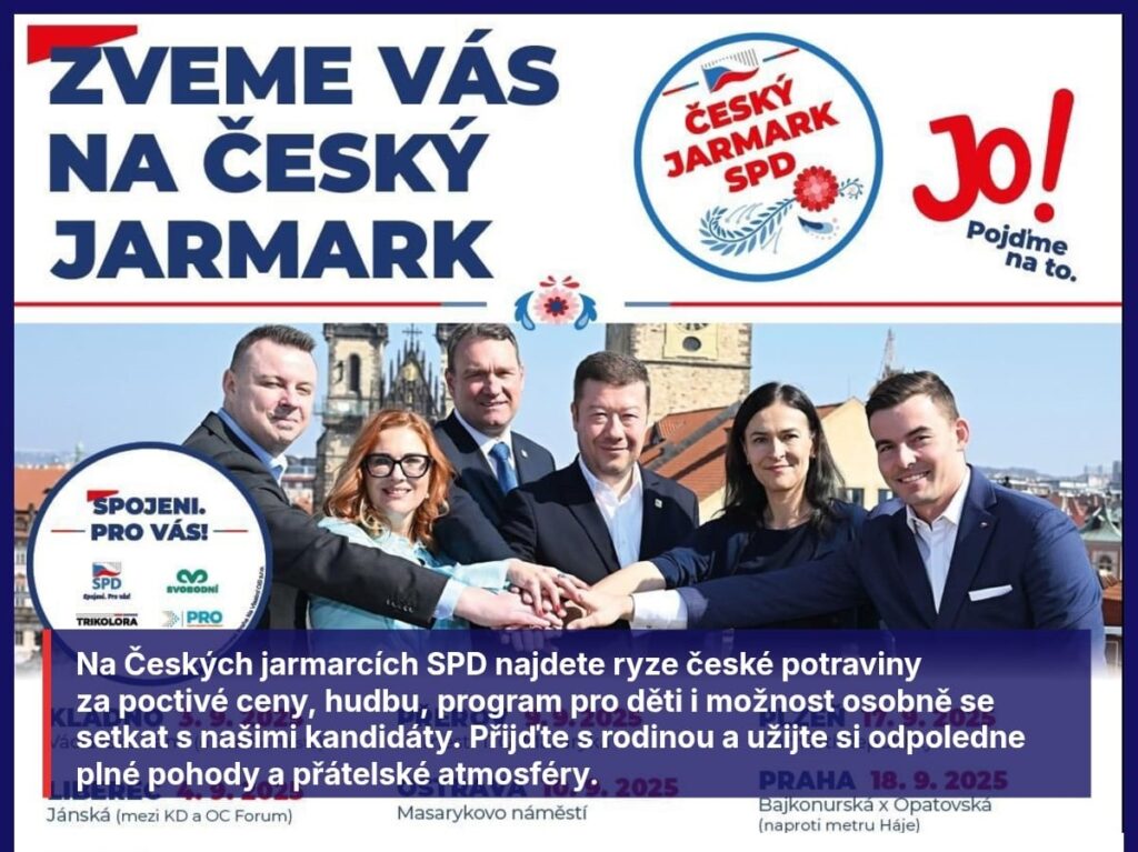 České jarmarky SPD pokračují i celé září! Tradiční České jarmarky SPD se staly nedílnou součástí volebních kampaní hnutí SPD. Tato oblíbená forma setkávání s občany si získala širokou podporu a důvěru lidí po celé republice, a proto je s radostí pořádáme i v rámci předvolební kampaně do letošních podzimních parlamentních voleb. České jarmarky SPD probíhají ve […]